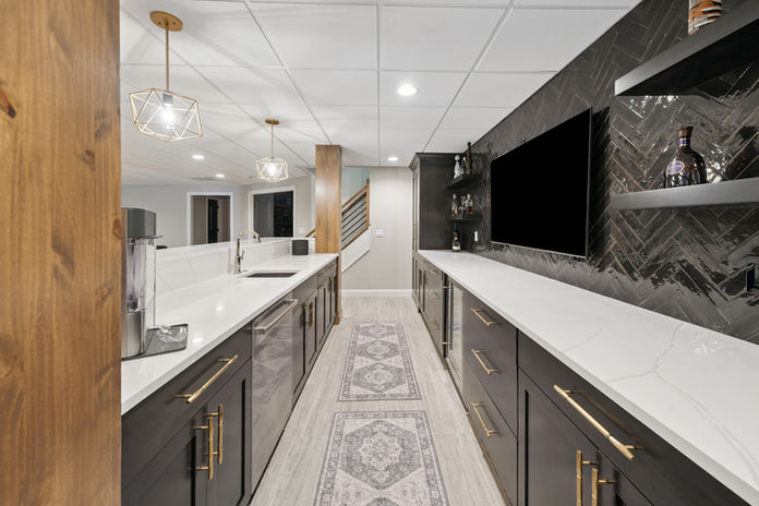 Inside, that same vibe continues. Crisp white backdrops are layered with rich wood textures and bold black accents, all elevated by elegant touches of gold. From fixtures to trim, these grounding details bring cohesion, depth, and contrast throughout the home.